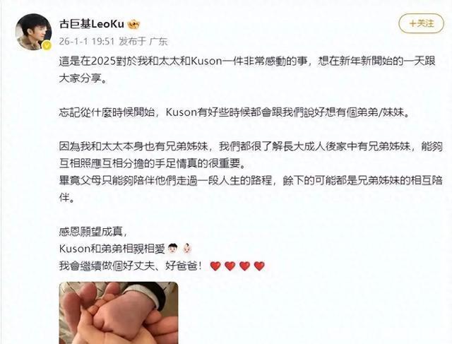 古巨基给出的理由极其朴素,甚至带着一丝让人心酸的现实考量——为了儿子。 他说,他害怕儿子孤单。 他和妻子的年龄摆在这里,岁月不饶人,他们深知无法陪伴孩子走完太过漫长的人生旅程。